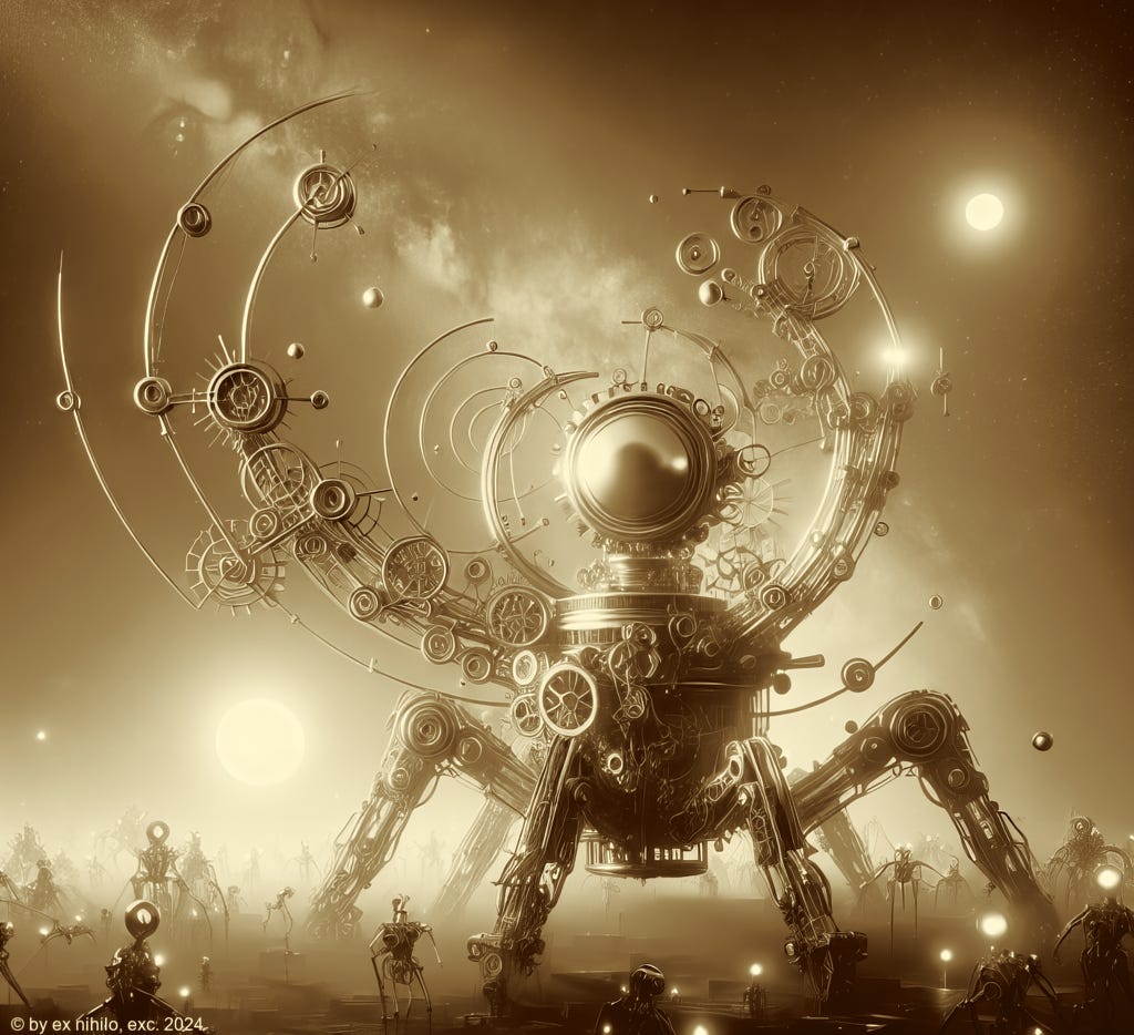 This refers to the symbolon/diabolon of the Machine’s desirous seduction, which is nothing more than our own. After all, the Machine, in the form of Artificial Intelligence, is nothing more than the reflexions of our genius —meaning ›Artificial Intelligence‹ is a misnomer as it’s actually a Reflective Intelligence. It’s a strange mixture of Protect me from what I want and our Burckhardtian re-phrasing as Protect me from what I’ve done.