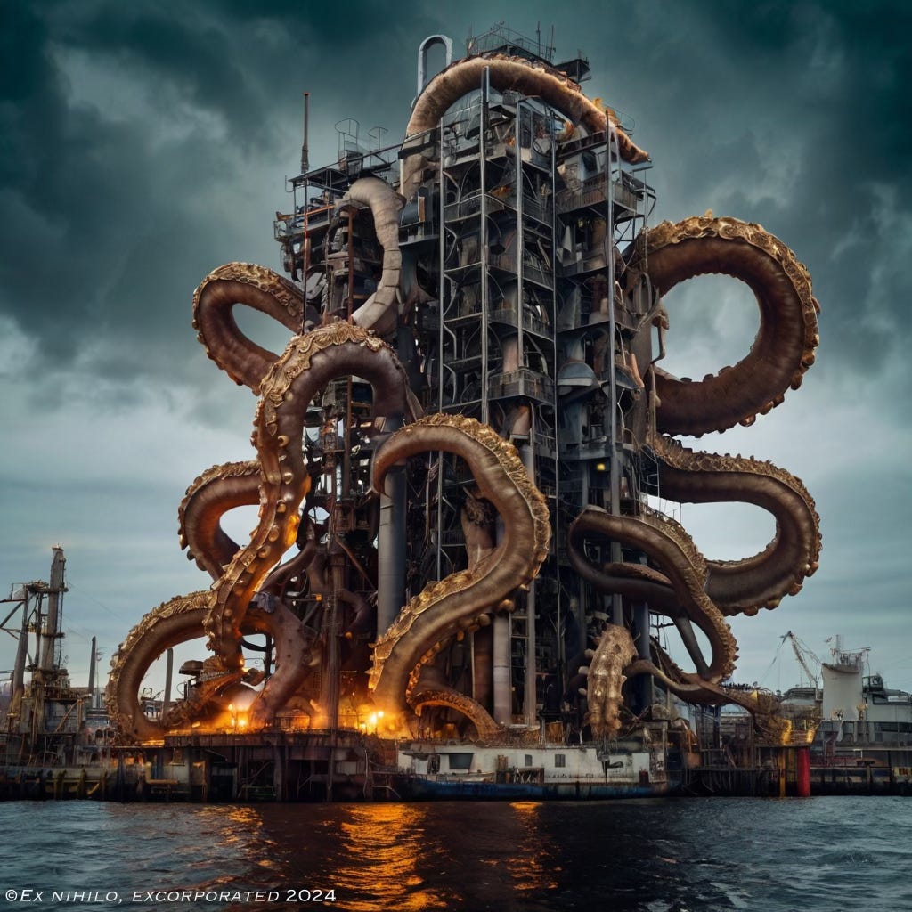 So, how can we describe the state of affairs? If a political theory has assigned the different habitats of land and sea to our political entities, such as Leviathan and Behemoth, the Hydra is rooted in a transitional zone between them. The myth tells us that the Monster is at home in the Lernaean swamps, a terrain where our conceptual tools fail. If, as an autochthonous being born into a particular nation, you're used to citing reasons for your political stance, you must realize that these submerged foundations are spongy at best, and it's better not to overstretch them beyond their local. This moment of blurring liquefaction is, in reality, the essence of our Social Software – even before it became Capitalism's operating system. So-called ›Software‹ originally referred to the water-soluble paper used on U-boats for recording encryption codes during the Second World War – because it ensured the enemy couldn’t retrieve the codes from the boat’s wreckage even if it sank. While this Liquefaction Logic was initially experienced as a dissolution of boundaries, the longue durée shows it goes hand-in-hand with gradually bogging down institutions. When Capital flows into a region of the World, a form of cosmopolitanism begins pulsating in people's minds, allowing the self-restraint of established institutional structures to fade away.